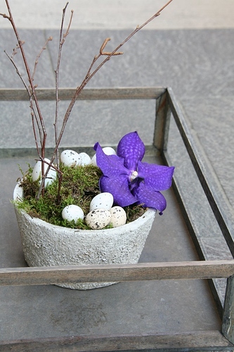 Ez a dísz akárhol megállja a helyét, de ez persze függ attól is, hogy milyen kaspót használsz fel hozzá. Mi a rusztikus beton mellett döntöttünk, amibe mohát, fűzfaágakat, fürjtojásokat, és fiolás orchideát használtunk. Persze választhatsz bármilyen más vágott virágot is, de ahhoz, hogy kitartson, mindenképp tedd egy kis üvegcsébe.