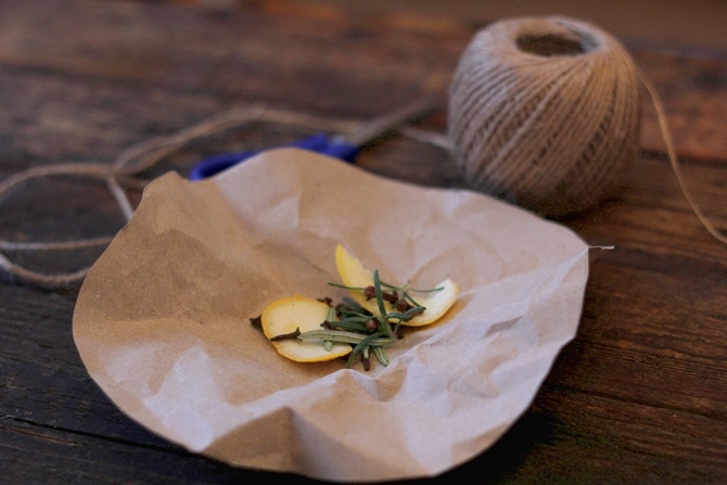 Zsírpapírból vágj ki egy kört, a közepére helyezz aromás fűszereket: szegfűszeget, fahéjat, rozmaringot, majd hámozd meg egy citromot, héjával együtt tedd a csomagba, végül spárgával, vagy valamilyen szalaggal/kötözővel kösd át. Teheted ruhásszekrénybe, de a konyhába, a wc-be vagy a fürdőszobába is!