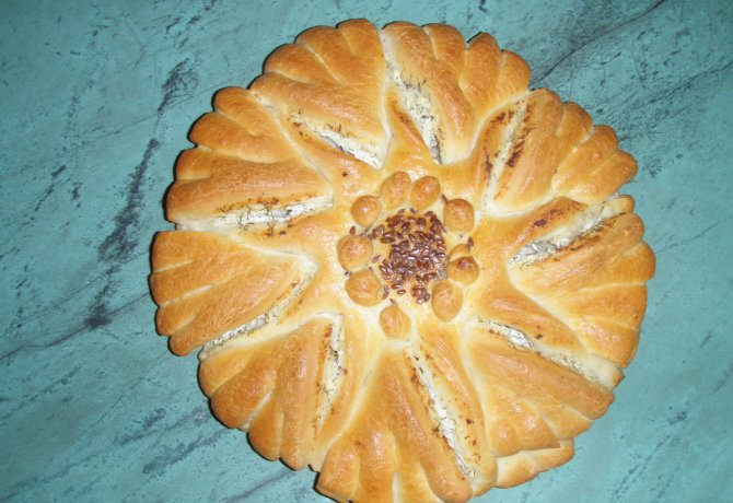 még ejtünk 1-2 bevágást 2 cm hosszan.A korábban levágott tésztadarabkákból pici gömböket sodrunk, ezekkel díszítjük a napraforgó közepét.