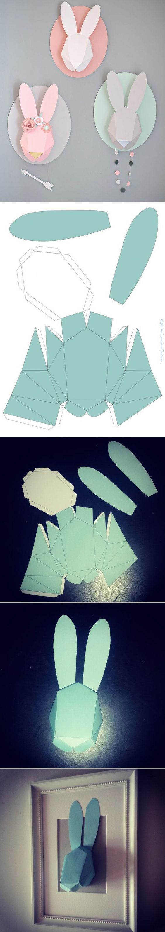 Készíts a falra egy egyszerű, letisztult nyúlfejet színes papírból! A trófea sablonját, itt megtalálod! Már csak ki kell nyomtatnod, kivágnod, és meghajtogatnod. Én tuti ezt készítem el idén!